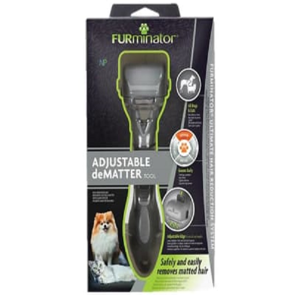 El DeMatter ajustable FURminator quita las motas de pelo incómodas en las razas de cabello largo y corto, y se debe usar semanalmente, o tan a menudo como sea necesario.
